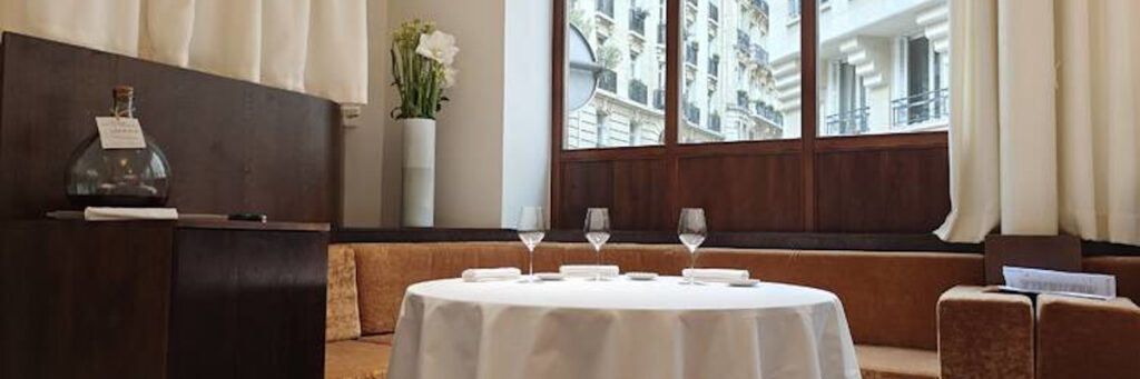 A noter un Menu en 5 plats à 145€ (Saint Jacques dans sa coquille, mâche nantaise, vieux Xéres +18€ ; Asperges de la famille Galis pochées dans le lait ; oseille Oursin givré, brioche, beurre noir ; Rouget, sur l’écaille, jus d’arêtes, sauce XO ; Bœuf jersiais au charbon, lard de seiche, œufs de hareng fumés Citron iodé confit et givré, huitres, herbes. Et un menu à 7 plats à 180€, soit les plats du menu précédent auxquels s’ajoutent du Caviar osciètre, transparence de riz et crème légèrement fumée. Accord mets et vins du sommelier en 7 verres à 115€